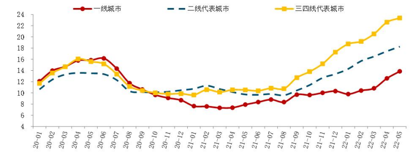其中,截至2022年5月底,按近6个月月均销售面积计算,一线城市短期库存出清周期13.9个月;二线代表城市出清周期18.3个月,较2021年末延长4.9个月,短期库存面临一定压力;三四线代表城市出清周期23.4个月,较2021年末延长6.1个月,市场库存去化压力较大。