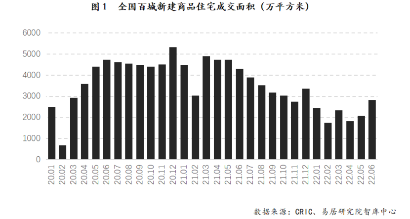 这一观点从5、6月的交易数据上也能佐证一二。根据中指研究院数据,2022年1-5月,全国商品房销售面积为5.1亿平方米,同比下降23.6%,商品房销售额为4.8万亿元,同比下降31.5%。5月,全国商品房销售面积、销售额同比降幅较4月分别收窄7.2和8.9个百分点,市场边际有所修复。初步统计,6月环比增幅在五成左右,同比降幅收窄至27%。易居研究院的数据则显示,6月全国百城新建商品住宅成交面积为2837万平方米,环比增长37%,同比下降34%,呈现“环比增速扩大、同比降速收窄”的良好态势,同时成为今年上半年成交最佳月份。