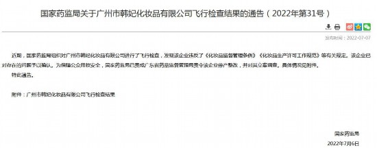 中新经纬7月7日电 7日,国家药监局通报称,近期对广州市韩妃化妆品有限公司进行了飞行检查,发现该企业违反了《化妆品监督管理条例》《化妆品生产许可工作规范》等有关规定,已责成广东省药品监督管理局责令该企业停产整改,并对其立案调查。