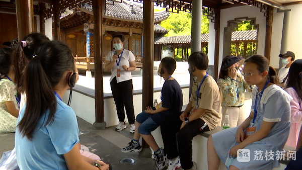 “这是红学大家吴新雷教授写的一副对联,曹府家声传织造,红楼遗韵演春秋,说的就是曹家在江宁织造时期的辉煌巅峰,以及《红楼梦》这部古典名著对后世的深远影响。”7月8日,在江宁织造博物馆西花园,博物馆工作人员向学生们介绍曹氏家族几代人历任江宁织造的故事。