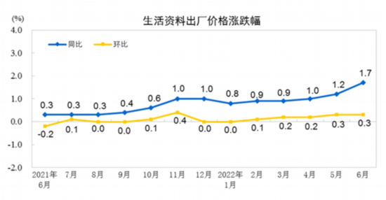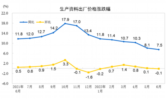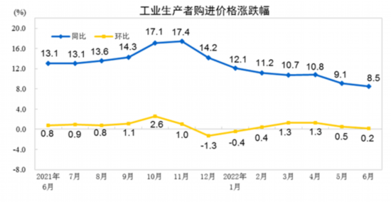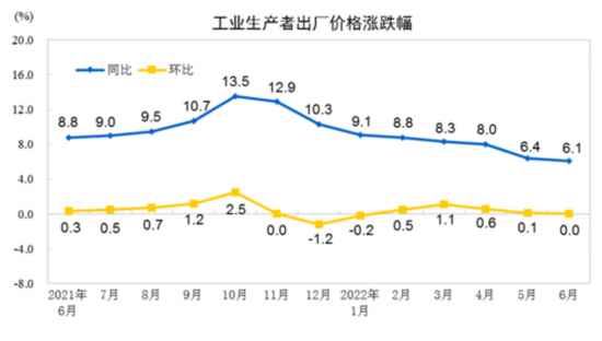 据国家统计局消息,2022年6月份,全国工业生产者出厂价格同比上涨6.1%,环比持平;工业生产者购进价格同比上涨8.5%,环比上涨0.2%。上半年,工业生产者出厂价格比去年同期上涨7.7%,工业生产者购进价格上涨10.4%。