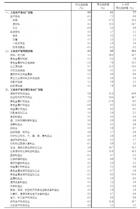 据测算,在6月份6.1%的PPI同比涨幅中,去年价格变动的翘尾影响约为3.8个百分点,新涨价影响约为2.3个百分点。
