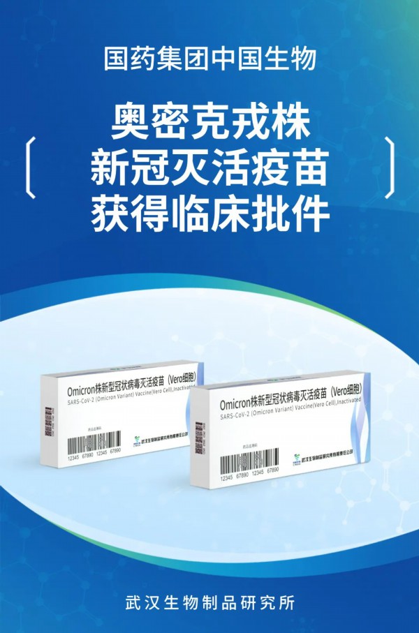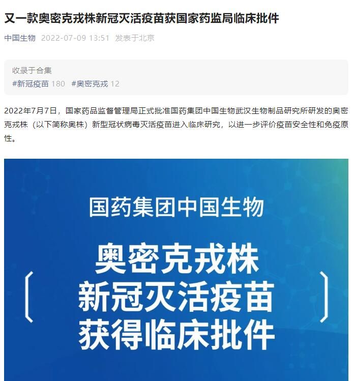 荔枝新闻讯 据“中国生物”微信公众号消息,2022年7月7日,国家药品监督管理局正式批准国药集团中国生物武汉生物制品研究所研发的奥密克戎株(以下简称奥株)新型冠状病毒灭活疫苗进入临床研究,以进一步评价疫苗安全性和免疫原性。