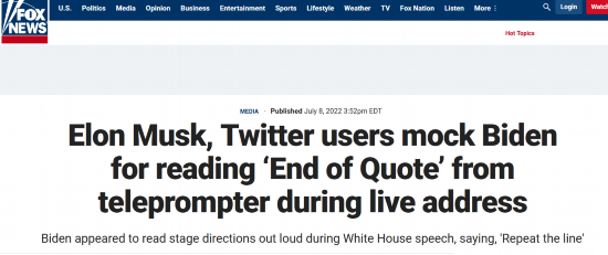 又尴尬了!据福克斯新闻网报道,美国总统拜登8日在讲话中将提词器中的“引用完毕”、“重复这行话”等提示性词语念出,引发包括特斯拉CEO马斯克等人的嘲讽。