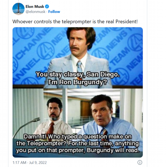 “谁控制提词器,谁就是真正的总统”,马斯克在推特上这样写道,他同时还配上一张美国喜剧电影《王牌播音员》中的剧照,在该电影中,主角伯甘蒂只会心不在焉读着提词器上的所有内容。