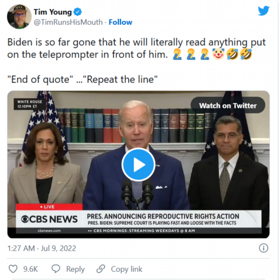 《华盛顿时报》专栏作家蒂姆·杨在推特上嘲讽道,“拜登已经走的太远了,他真的会阅读他面前提词器上写着的任何东西……”,并配上“扶额”“小丑”“笑哭”表情包。