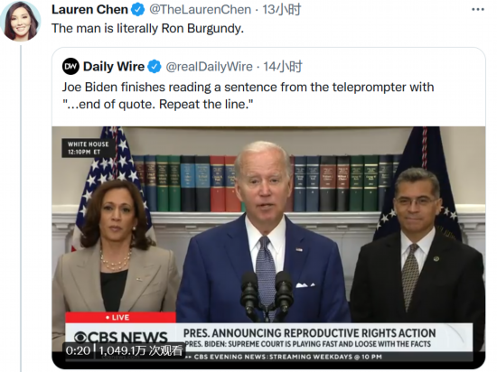 “值得注意的是,登记参加投票和投票的女性的百分比始终高于男性。引用结束。”拜登接着说道,“重复这行话”,随后他又开始重复上一句话,紧接着开始下一部分的讲话,就像什么也没发生过一样。