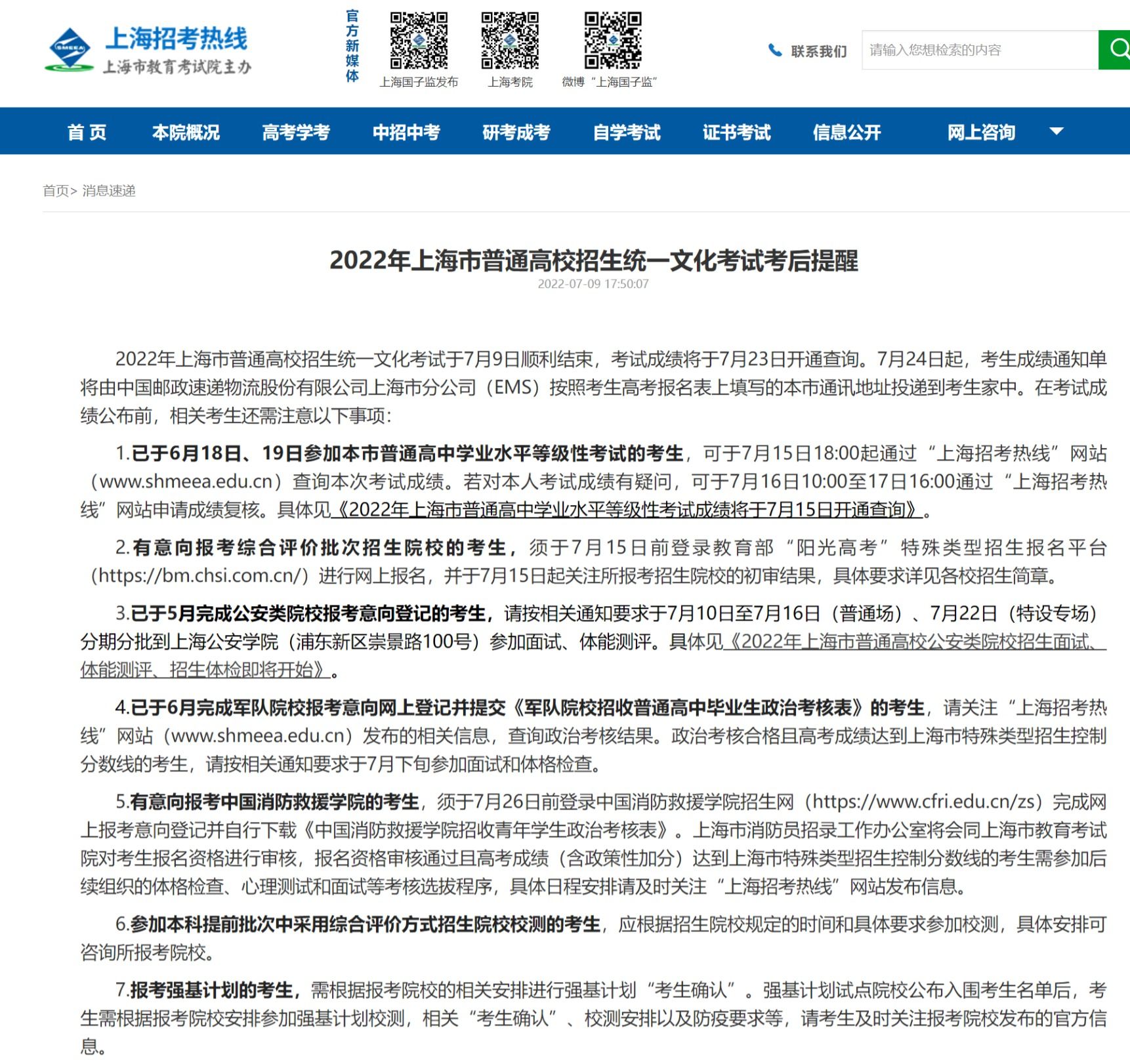 2022年上海市普通高校招生统一文化考试于7月9日顺利结束,考试成绩将于7月23日开通查询。7月24日起,考生成绩通知单将由中国邮政速递物流股份有限公司上海市分公司(EMS)按照考生高考报名表上填写的本市通讯地址投递到考生家中。在考试成绩公布前,相关考生还需注意以下事项: