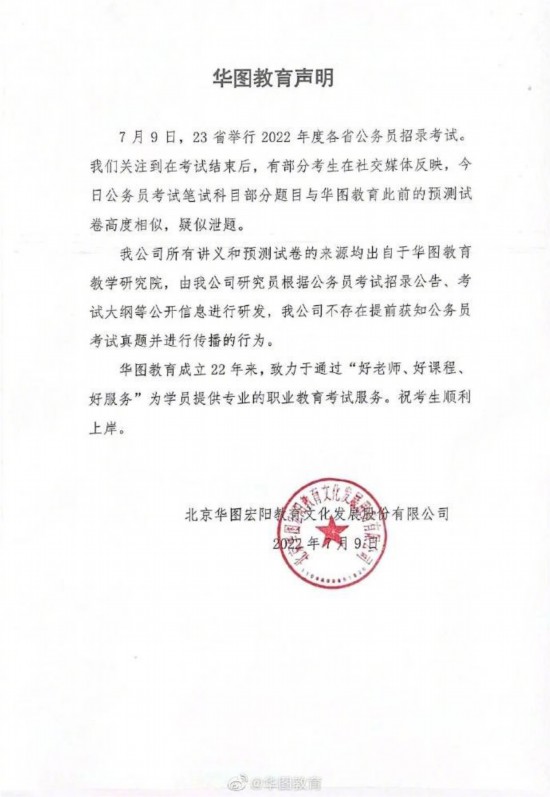 荔枝新闻讯 @华图教育 微博7月9日发布消息,回应“公务员考试疑似泄题”。内容如下: