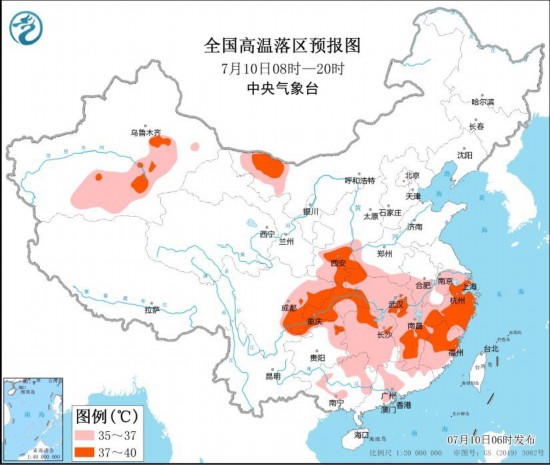 预计7月10日白天,陕西中南部、河南南部、江淮西部、江汉、江南、西南地区东部以及内蒙古西部、新疆南疆盆地等地有35℃以上高温天气,其中,陕西中南部、河南西南部、浙江大部、福建中北部、江西中部、湖南北部、湖北西部和东南部、四川盆地中东部和南部、重庆以及内蒙古西北部、新疆南疆盆地等地部分地区最高气温37~39℃,局地可达40℃以上。
