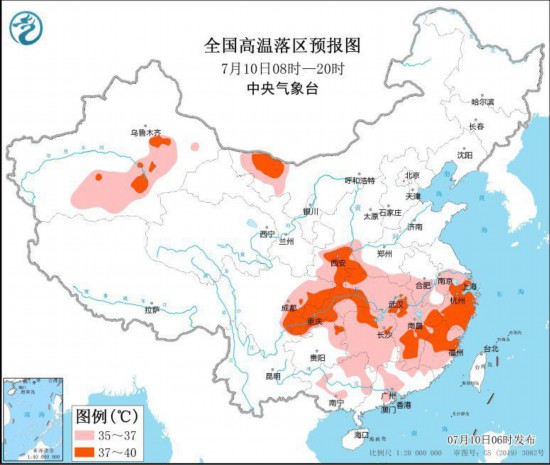 中央气象台7月10日06时继续发布高温黄色预警:预计7月10日白天,陕西中南部、河南南部、江淮西部、江汉、江南、西南地区东部以及内蒙古西部、新疆南疆盆地等地有35℃以上高温天气,其中,陕西中南部、河南西南部、浙江大部、福建中北部、江西中部、湖南北部、湖北西部和东南部、四川盆地中东部和南部、重庆以及内蒙古西北部、新疆南疆盆地等地部分地区最高气温37~39℃,局地可达40℃以上。