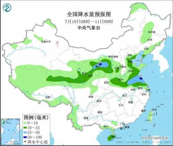 7月10日08时至11日08时,青海南部和东部、甘肃南部、宁夏、内蒙古河套地区、陕西北部、华北东部、黄淮南部和西部、江淮、海南岛等地的部分地区有中到大雨,局地有暴雨(50~55毫米)。新疆东部部分地区有6~7级风。