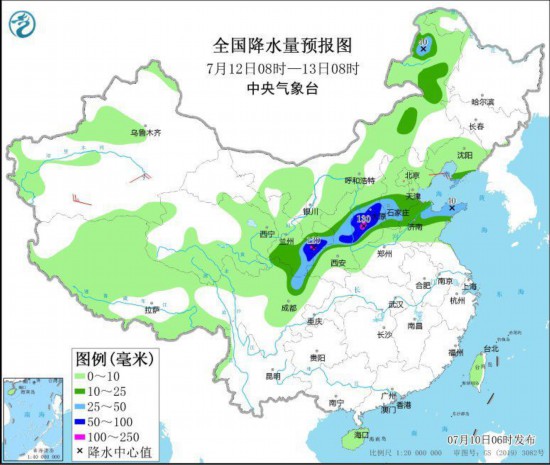 7月11日08时至12日08时,青海南部、甘肃南部、陕西、山西、河北中南部、天津、山东中西部、四川北部等地有中到大雨,其中,甘肃东部和南部、陕西中部和北部、山西中北部、河北中南部、山东北部等地夫人部分地区有暴雨,局地有大暴雨(100~150毫米)。新疆南疆盆地、华北东部等地有4~6级风。
