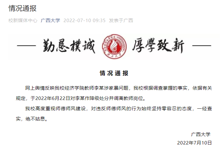 荔枝新闻讯 “广西大学”微信公众号7月10日消息,针对广西大学副教授家暴妻子7年一事,广西大学发布通报:网上舆情反映我校经济学院教师李某涉家暴问题,我校根据调查掌握的事实,依据有关规定,于2022年6月22日对李某作降级处分并调离教师岗位。