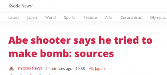 共同社:消息来源称,枪击安倍的嫌疑人称他曾试图制造炸弹