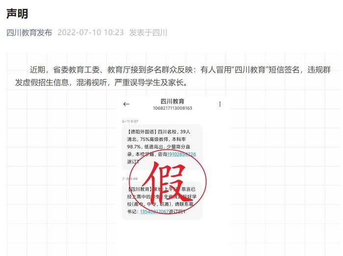 荔枝新闻讯 据“四川教育发布”微信号消息,近期,四川省委教育工委、教育厅接到多名群众反映:有人冒用“四川教育”短信签名,违规群发虚假招生信息,混淆视听,严重误导学生及家长。