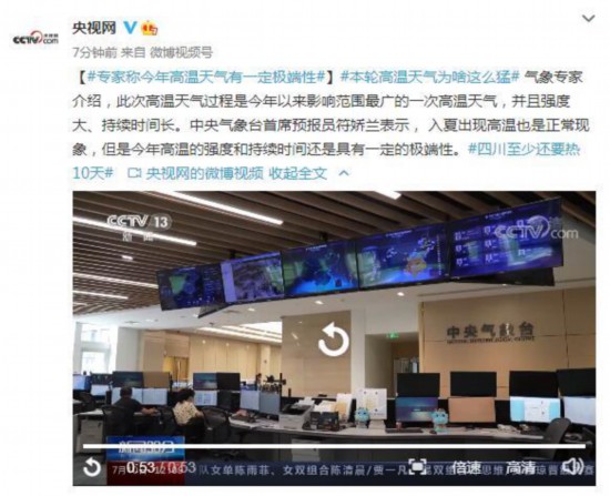 本轮高温天气为啥这么猛?气象专家介绍,此次高温天气过程是今年以来影响范围最广的一次高温天气,并且强度大、持续时间长。中央气象台首席预报员符娇兰表示, 入夏出现高温也是正常现象,但是今年高温的强度和持续时间还是具有一定的极端性。