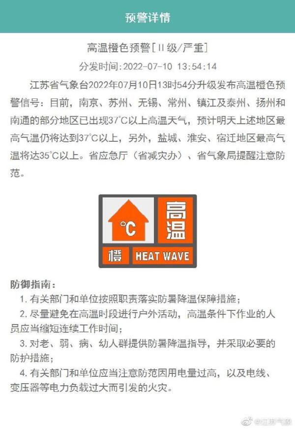 10日下午,江苏省气象台升级发布高温橙色预警信号,南京、苏州、无锡、常州、镇江及泰州、扬州和南通的部分地区都已出现37℃以上高温天气,其中,宜兴的最高温度达到了39.8℃,登上“江苏最热榜”榜首,紧随其后的是39℃的溧阳和38.7℃的江阴。
