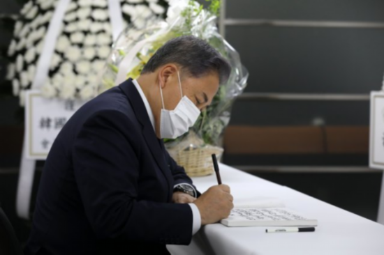 报道称,朴振结束吊唁后接受记者采访时表示,他曾在韩日议员友好活动中与安倍见面,原本计划若访问日本,他将拜访安倍,听取安倍对各方面的建议。他称,安倍遇袭身亡的消息令所有人感到震惊。朴振还在吊唁簿上留言,向安倍的家属和日本国民表示慰问。