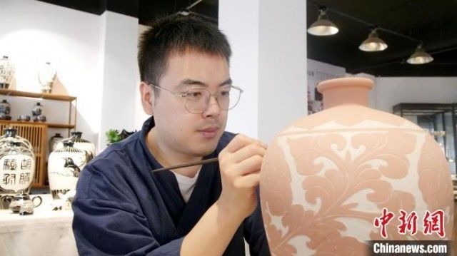 图为赵英杰在磁县磁州窑工作室内为陶瓷进行剔花作业。 崔岩 摄