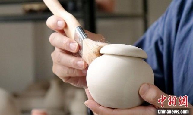 图为赵英杰在磁县磁州窑工作室为瓷坯除尘。 崔岩 摄