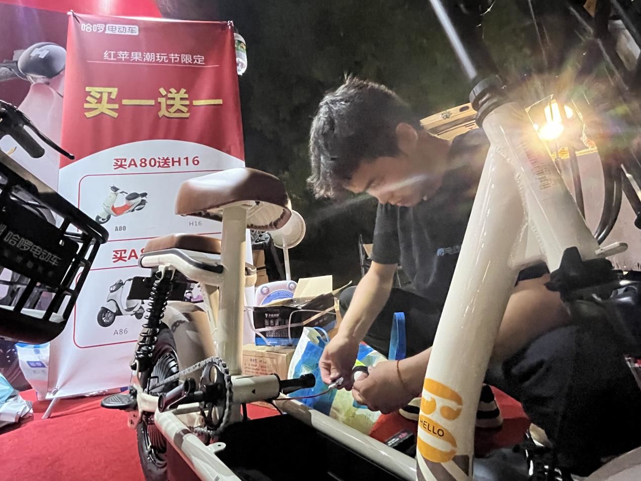从白昼的在店守候到夜幕降临时走向消费者,哈啰电动车将触角更进一步深入年轻群体的领地。潮玩节现场,哈啰电动车带来了集“智能、品质、颜值”于一身的多种车款展销,带领年轻人解锁“手机APP一键开关”“行车轨迹实时监测”“双模定位更防盗”等智能骑行体验。主打车型A80、A86自去年推出以来,便依托智能化功能及一流的设计外观受到市场欢迎,本次哈啰将其拿出做买一赠一活动(买A86送A10,买A80送H16),吸引了不少消费者驻足围观及咨询。