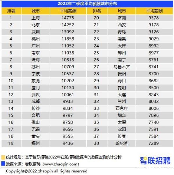 记者从《报告》中了解到,二季度全国38个核心城市平均招聘薪酬为10341元/月,比一季度的10014元/月上涨3.3%。珠三角地区深圳、广州、珠海和长三角地区杭州、南京、苏州、宁波的月薪也仍然处于领先地位,具备较高人才吸引力。