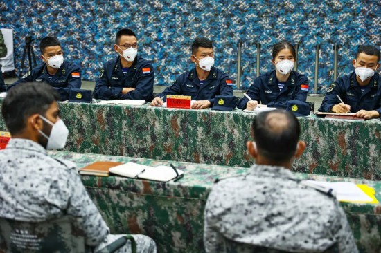 11日上午,中巴双方组织了战术指挥推演。联合导演部发布作战时间和演习想定背景后,联合编队指挥所带领双方参演兵力指挥员根据作战时间、可能的导调情节和协同计划,依次报告了作战行动要点。推演结束后,中巴双方官兵代表就主副炮射击、直升机驻舰保障、对潜搜索与攻击、舰艇区划损管、海上航行补给等项目展开专业技术交流。