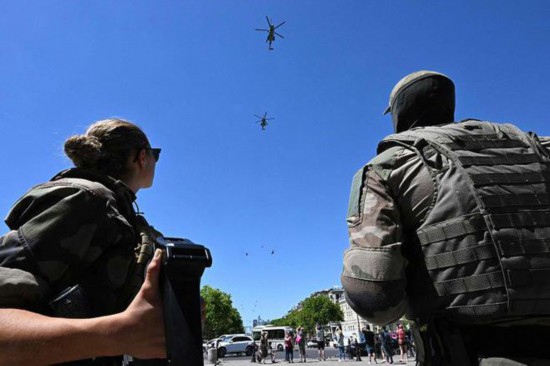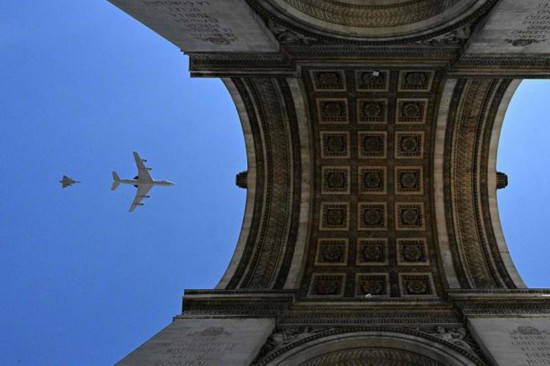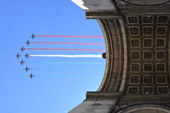 当地时间2022年7月11日,法国巴黎,香榭丽舍大道上举行国庆日游行前,法国空军的阿尔法战机在凯旋门上空排演,释放出法国国旗的红白蓝三色烟雾。