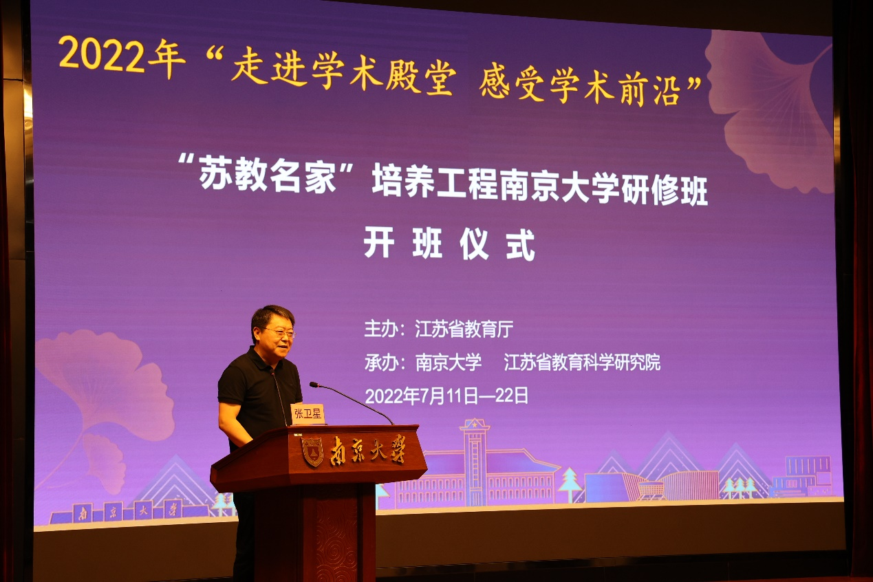省教育厅教师工作处张卫星处长在开班仪式上对学员学习提出了具体要求,他即兴引用唐代诗人高骈的一首诗《山亭夏日》:“绿树阴浓夏日长,楼台倒影入池塘。水晶帘动微风起,满架蔷薇一院香”,并通过对此诗的意境解读来表达对“苏教名家”培养工程南京大学研修班的祝福和期待。他表示,此次暑期培训机会难得,希望学员们能珍惜在南京大学校园聆听大家讲座的机会,并能将培训成果运用到未来的实际工作中去,他特别强调研修学习的同时也要做好疫情防控工作。