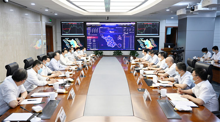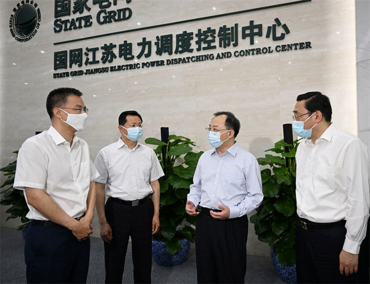 在国网江苏省电力公司,吴政隆听取全省电力运行、迎峰度夏工作情况汇报,详细了解电厂电煤储备、燃煤机组燃气机组最大出力、区外来电落实、新型电力负荷管理系统运行等情况。吴政隆指出,今年是党的二十大召开之年,做好电力保供工作责任重大、意义重大。特别是当前,高温天气持续多日,我省用电负荷连续高位运行,全社会用电量、工业用电量快速增长,既反映了经济加快恢复向好,也对迎峰度夏工作带来重大考验。希望国网江苏省电力公司胸怀“两个大局”、牢记“国之大者”,坚决扛起保供“主力军”的责任担当,增强忧患意识,做好万全准备,精心组织调度,安全稳定运行,以更加优良的作风、更加科学精准的举措做好电力保障工作,为人民群众创造平稳有序的生产生活环境。要密切跟踪天气变化、用电需求等情况全力保障供给,与政府职能部门和发电企业共同做好电煤和发电天然气组织供应,加强机组运行管理,确保高峰时段应发尽发、稳发满发,用好白鹤滩—江苏等特高压输电通道,统筹利用好风光电、核电等清洁能源,加强电力资源组织,最大限度增加高峰时段供给能力。要树牢底线思维,针对极端天气等突发情况,细化实化应急处置预案,加强对重要输电通道和各类设备的运维管控,及时排除故障隐患,强化电力网络信息系统安全,全力保障电网运行安全。在了解新型电力负荷管理系统运行情况后,吴政隆说,应对高峰时段电力供应缺口,要在抓好供给侧的同时,精准高效强化需求侧管理。要充分利用新型电力负荷管理系统,优先保障城乡居民、农业、重要公用事业和公益性服务等用电需求,优先调控企业非生产负荷和辅助生产负荷,切实做好需求响应、错峰避峰的工作方案,促进产业链供应链安全稳定。要更加关心关爱坚守一线特别是户外作业的广大职工,因地制宜做好防暑降温工作。