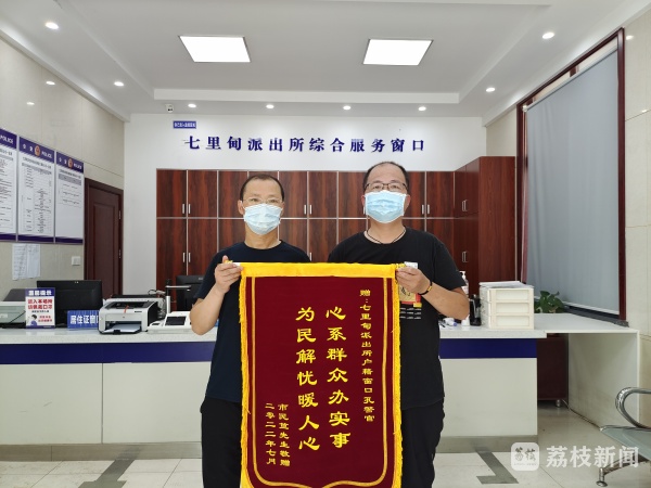 七里甸派出所综合服务窗口的暖心服务让笪先生倍感亲切,更加感谢孔祥顺的悉心指导。于是,笪先生制作了这面大红锦旗送给孔祥顺,为七里甸派出所综合服务窗口的便民利民认真负责“点赞”。
