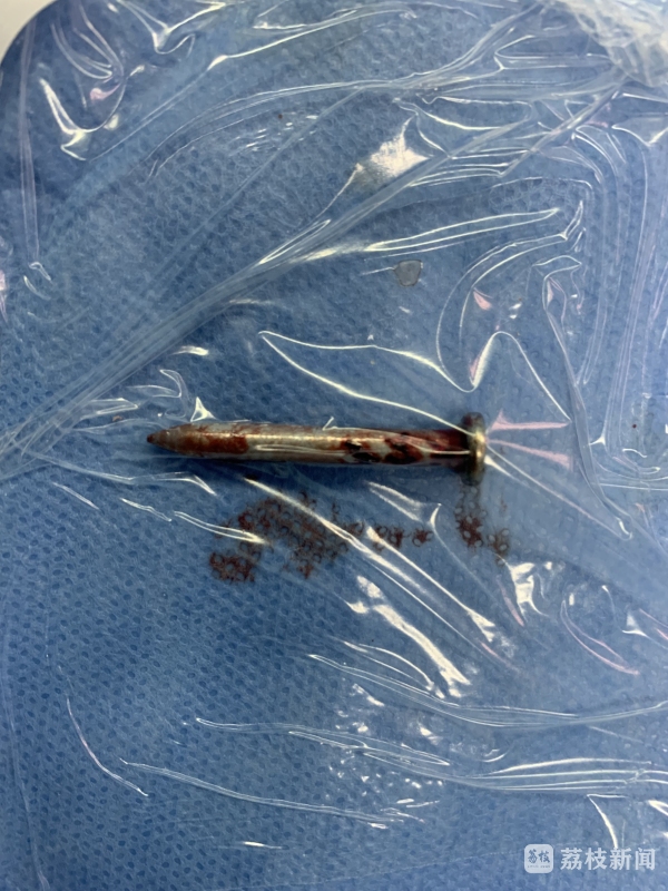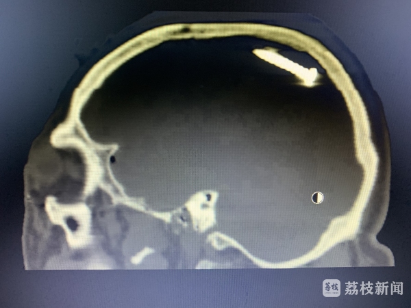 7月10日周六中午,正在家中休息的张勇接到医院电话,120急救车送来一位52岁的脑外伤患者,脑内有钉样异物,一侧瞳孔已经散大。身旁的工友描述,施工时使用射钉枪,不小心水泥钉从额部飞进脑门。结合影像检查及术中所见,可以判断水泥钉是从左前额进入颅内,穿过左脑,撞击后方颅骨后又转向前上方。途中转了个圈,形成长约二十几公分的脑内伤道,割破大脑镰,还搅破了很多小血管,形成小的创伤性动脉瘤,并形成了大量伤道内血肿。“所幸术前备了c臂、瘤夹等,几经周折,花费了10余小时终于顺利清除钢钉、碎骨片及大量血肿,复查CT提示手术效果满意。”张主任说,只要患者顺利度过感染关,预后应该是比较理想的。