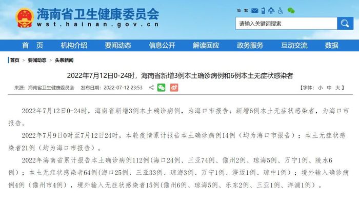 荔枝新闻讯 2022年7月12日0-24时,海南省新增3例本土确诊病例,为海口市报告;新增6例本土无症状感染者,为海口市报告。