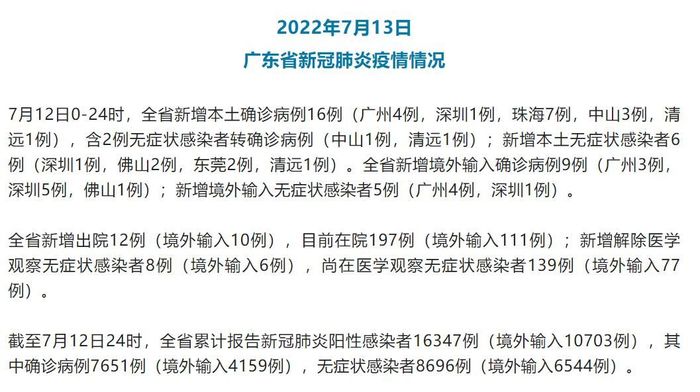 截至7月12日24时,广东省累计报告新冠肺炎阳性感染者16347例(境外输入10703例),其中确诊病例7651例(境外输入4159例),无症状感染者8696例(境外输入6544例)。