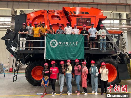 图为浙江师范大学留学生参访团在刚组装完成的采棉机上合影留念。浙江师范大学供图