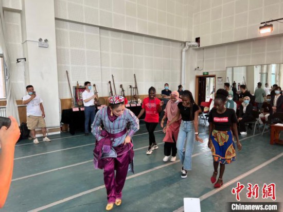 图为浙江师范大学留学生参访团在新疆艺术剧院木卡姆艺术团向专业艺术家学习舞蹈。浙江师范大学供图