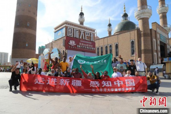 图为浙江师范大学留学生参访团在新疆国际大巴扎合影。浙江师范大学供图