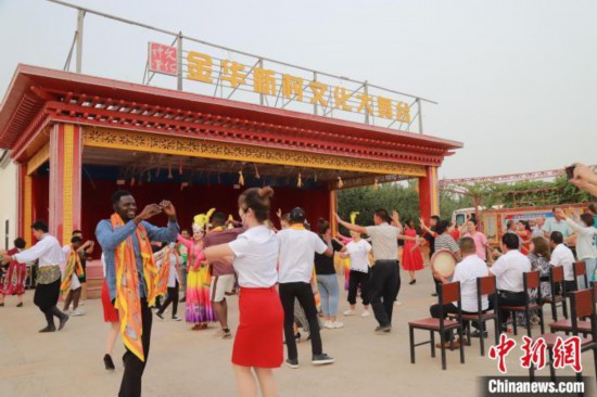 图为浙江师范大学留学生参访团与阿克苏地区温宿县金华新村村民一起跳民族舞蹈。浙江师范大学供图