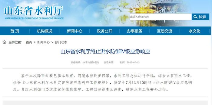 荔枝新闻讯 据山东省水利厅官网消息,鉴于本次降雨过程已基本结束,河湖水势逐步回落,水利工程总体运行平稳,综合当前雨水工情,依据《山东省水利厅水旱灾害防御应急响应工作规程》,决定于7月13日10时终止洪水防御Ⅳ级应急响应。各级水利部门要继续做好值班值守、工程监测巡查及调度,确保水利工程安全运行。