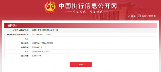 中国网财经7月13日讯 据中国执行信息公开网,近日,新疆拉夏贝尔服饰股份有限公司新增一则恢复执行信息,执行标的1295万余元,执行法院为天津市第一中级人民法院。