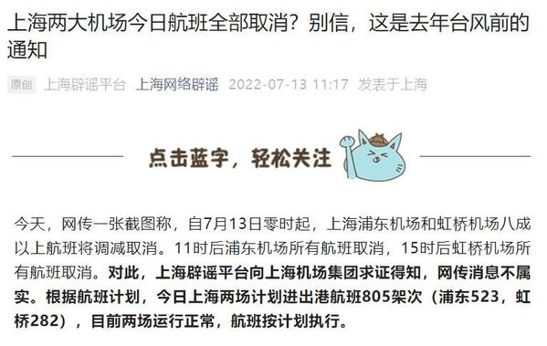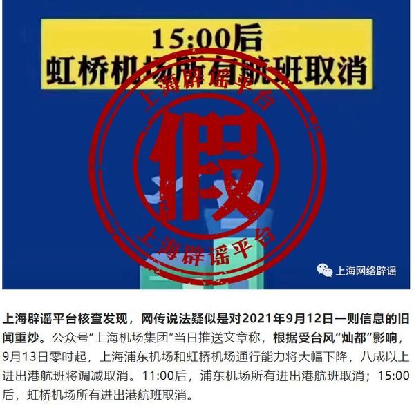 上海辟谣平台核查发现,网传说法疑似是对2021年9月12日一则信息的旧闻重炒。公众号“上海机场集团”当日推送文章称,根据受台风“灿都”影响,9月13日零时起,上海浦东机场和虹桥机场通行能力将大幅下降,八成以上进出港航班将调减取消。11:00后,浦东机场所有进出港航班取消;15:00后,虹桥机场所有进出港航班取消。