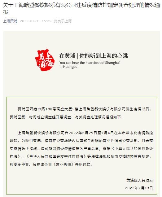 荔枝新闻讯 上海黄浦微信公众号7月13日下午发布关于上海晗登餐饮娱乐有限公司违反疫情防控规定调查处理的情况通报。全文如下:
