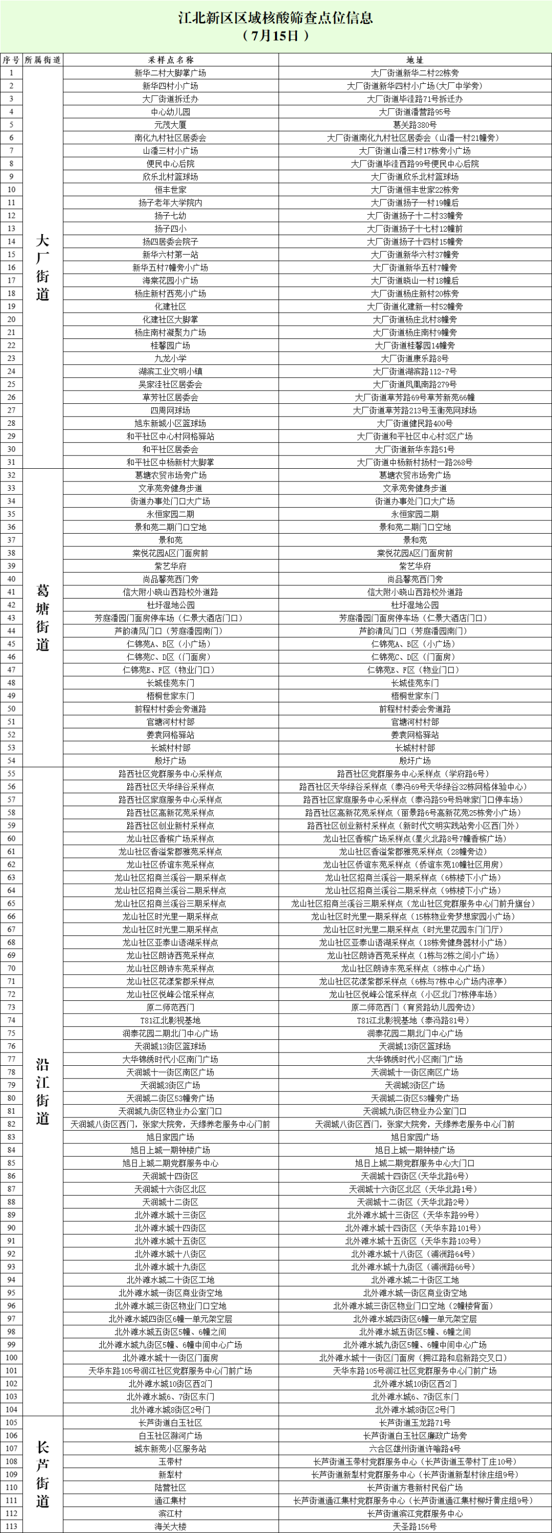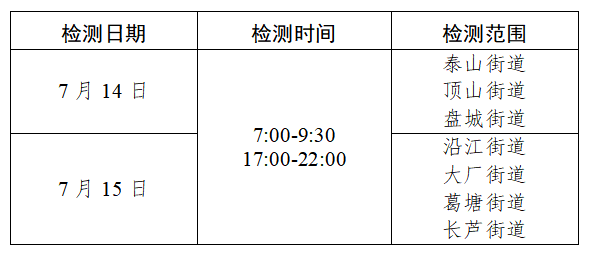 根据当前疫情防控工作需要,江北新区新冠肺炎疫情联防联控工作指挥部决定于7月14日、15日在全区开展规模性核酸检测工作,现将有关事项通告如下: