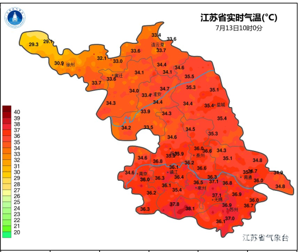 今年夏季,江苏的副热带高压与常年同期相比,偏北偏强。据江苏省气象台发布的消息,今天(7月13日)上午10点,全省最高气温已经冲破38℃(宜兴)。