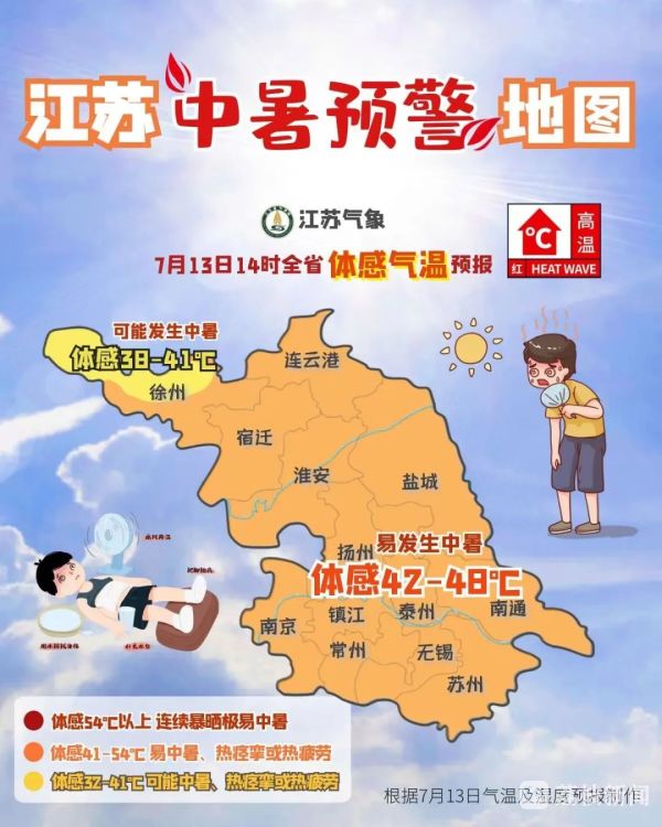 2022年07月13日10时06分,江苏省气象台继续发布高温红色预警信号。预计今天白天南京、镇江、常州、无锡、苏州、扬州南部、泰州南部,最高气温将升至40℃左右,淮河以南其它地区最高气温将升至37℃以上。