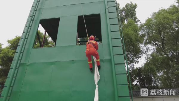 如果情况比较紧急,而自己此时又恰巧在低楼层,比如三层以下,市民朋友也可以利用宾馆内的床单或者消防水带进行快速逃生。拉紧、收紧后再用两边的余长在主绳、主床单上打一个半结加固,最后收紧就可以了。需要注意的是,由于床单的表面比较光滑,还需要在连接好的床单上每隔40厘米左右打一个半结,增加摩擦。那么之后该怎么操作呢?为了确保安全,消防救援人员将演练的场地搬到了消防训练塔上。据消防员介绍,无论是借助床单还是水带,在尝试前都需要先将它们固定好,也就是找到一个安全的锚点才能操作。这时候需要再次使用打结的方法,消防员用水带进行了操作。之后,再将水带或者床单绕在身上,身体坐在窗台边,两手分别抓住水带或者床单的两端并握紧,将身体慢慢悬空于窗外,腿蹬窗台,一点点往下滑。使用这两种方法,消防员最终都安全抵达了地面。