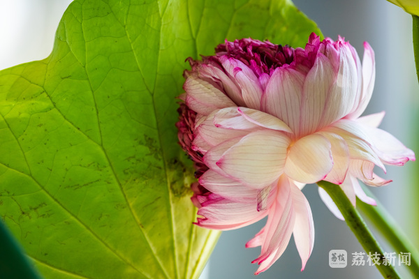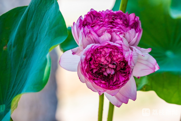 近日,在玄武湖金陵盆景园内出现一株千瓣同心莲,千瓣莲花瓣外瓣大,内瓣逐渐缩小,最小的花瓣只有米粒大,花瓣数达1000枚以上。这株千瓣莲则二莲同干,两朵莲花都已盛开,花瓣白粉色,重叠错落,娇嫩可人。