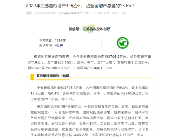 省农业农村厅14日晚正式发布我省夏粮收获情况。统计显示,今年江苏省夏粮播种面积3706.2万亩,单位面积产量377.8公斤,总产量280.1亿斤,呈现面积、单产、总产“三增”形势,增幅均高于全国水平。其中,总产较上年增加3.9亿斤,占全国增产总量的13.6%!