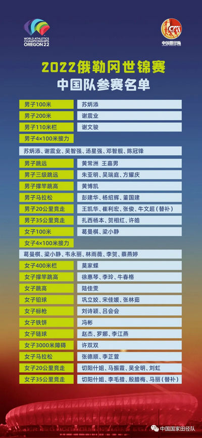 人民网北京7月13日电 (记者杨磊)7月13日,中国田径协会正式公布了2022年田径世锦赛中国田径队参赛名单。本届世锦赛将于当地时间7月15日-7月24日在美国俄勒冈州第三大城市尤金进行。中国田径队共派出23名男子运动员、30名女子运动员参与23个项目的角逐。